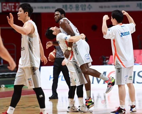 25일 경기 고양시 일산서구 고양체육관에서 열린 ‘2020-2021 현대모비스 프로농구’ 고양 오리온과 인천 전자랜드의 경기에서 인천 전자랜드가 고양 오리온에게 73-71로 승리를 거둔 뒤 탐슨이 동료들의 축하를 받고 있다.