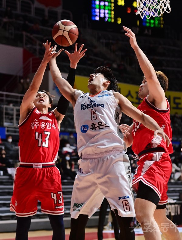 25일 경기 고양시 일산서구 고양체육관에서 열린 ‘2020-2021 현대모비스 프로농구’ 고양 오리온과 인천 전자랜드의 경기에서 고양 오리온 이대성과 인천 전자랜드 차바위가 리바운드 다툼을 하고 있다.