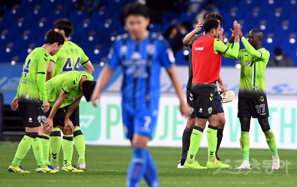 25일 울산 문수월드컵경기장에서 열린 ‘하나원큐 K리그1 2020’ 울산 현대와 전북 현대의 경기에서 전북이 1-0으로 울산에 승리한 뒤 선수들이 그라운드에서 기쁨을 나누고 있다.