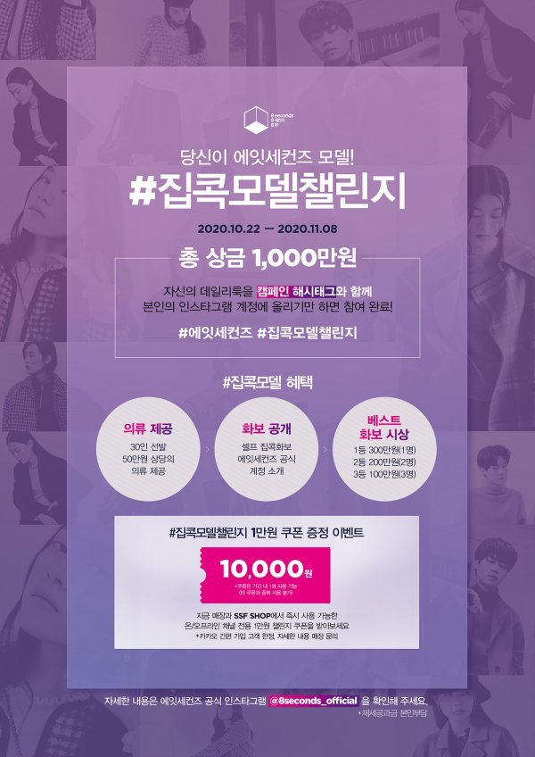 본인의 특색 있는 데일리룩을 해시태그(#에잇세컨즈 #집콕모델챌린지)와 함께 인스타그램에 올리면 된다. 선발자 30명에게 50만 원 상당의 가을·겨울 시즌 신상품을 제공한다. 이들이 직접 촬영한 ‘셀프 집콕 화보’를 에잇세컨즈 공식 인스타그램 계정에 공개하며 투표를 통해 베스트 화보를 선정한다.