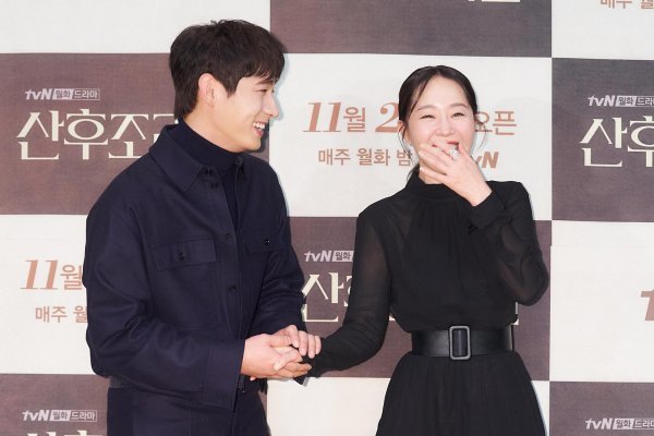 배우 윤박(왼쪽)과 엄지원이 26일 오후 tvN 월화드라마 \'산후조리원\' 온라인 제작발표회에 참석해 포즈를 취하고 있다.