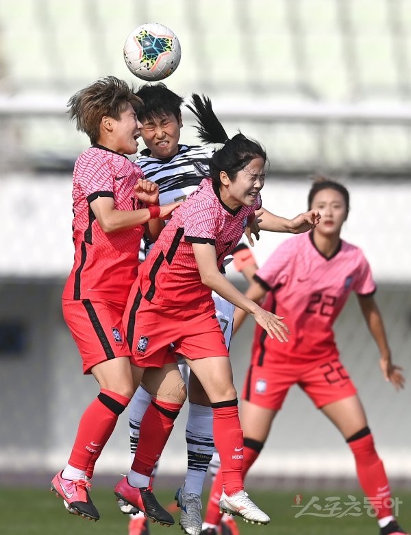 U-20 대표팀 정민영이 국가 대표팀 여민지, 이민아와 공중볼을 다투고 있다.