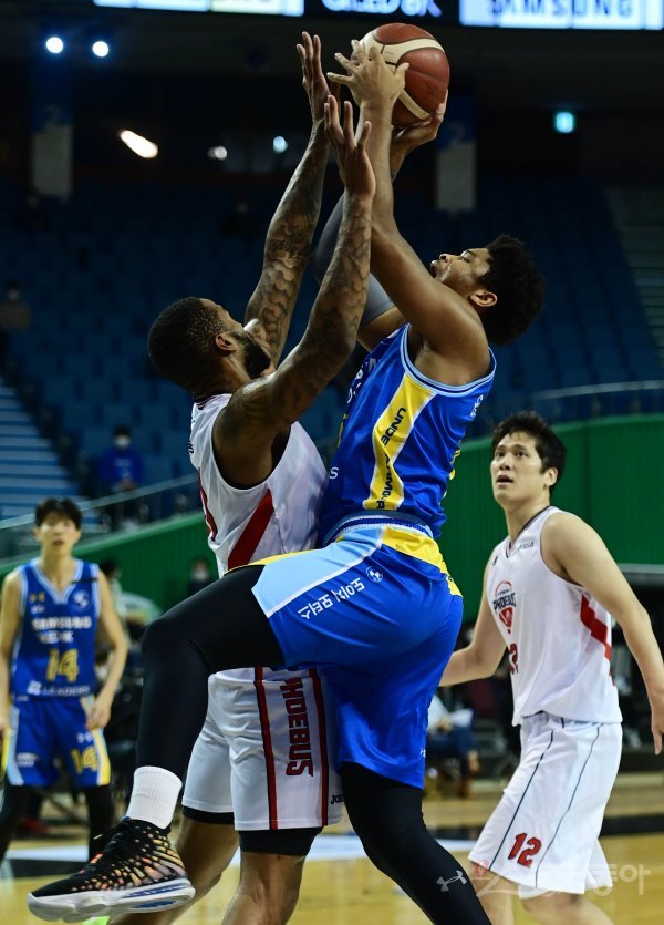 26일 서울 잠실실내체육관에서 열린 ‘2020-2021 현대모비스 프로농구’ 서울 삼성과 울산 현대모비스의 경기에서 서울 사성 힉스가 울산 현대모비스 숀롱 앞에서 슛을 쏘고 있다.