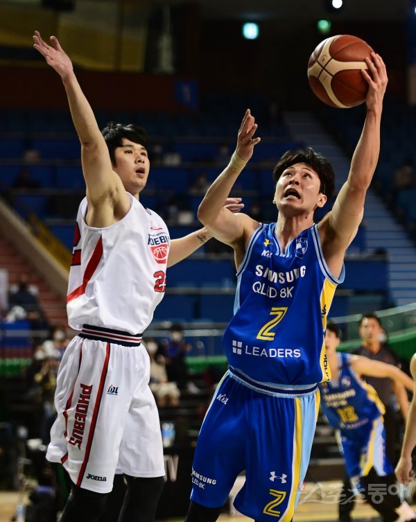 26일 서울 잠실실내체육관에서 열린 ‘2020-2021 현대모비스 프로농구’ 서울 삼성과 울산 현대모비스의 경기에서 서울 이현민이 울산 현대모비스 김상규의 앞에서 슛을 쏘고 있다.