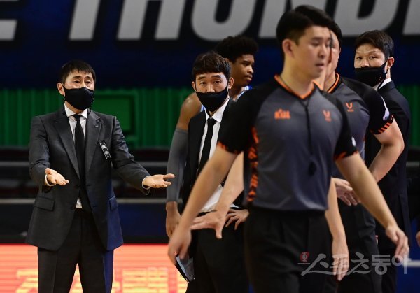26일 서울 잠실실내체육관에서 열린 ‘2020-2021 현대모비스 프로농구’ 서울 삼성과 울산 현대모비스의 경기에서 서울 삼성 이상민 감독이 심판 판정에 항의하고 있다.