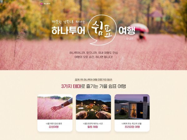 하나투어(대표이사 김진국, 송미선)는 힐링여행 기획전 ‘하나투어 쉼표 여행-국내편’을 진행한다.하나투어는 신종 코로나바이러스 감염증(코로나19) 사태로 인해 몸과 마음을 돌아보기 어려운 일상에서 벗어나 나를 위한 여유로운 시간을 선사한다는 취지로 ‘쉼표 여행’을 기획했다. 국내 인기 여행 지역인 제주, 여수, 부산, 남해, 경주를 중심으로 3가지 쉼표 테마인 감성 여행, 힐링 체험, 프리미엄에 맞춰 각 지역의 여행 상품을 확인할 수 있다.