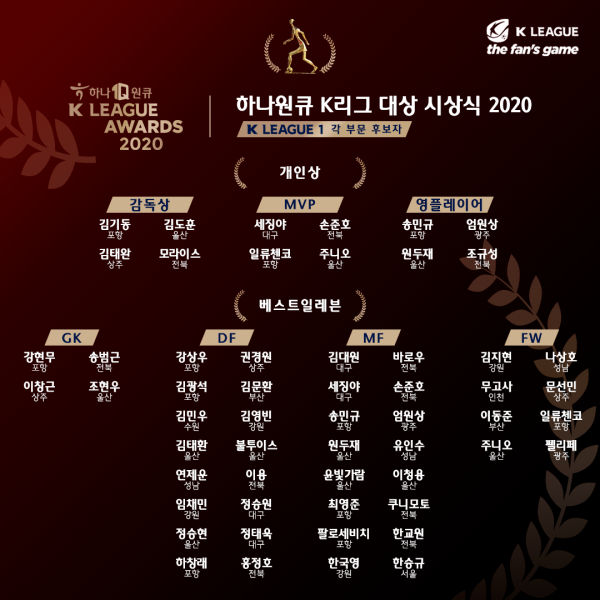 최우수감독상 후보에는 김기동(포항), 김도훈(울산), 김태완(상주), 모라이스(전북) 등이 이름을 올렸고, 영플레이어상은 송민규(포항), 엄원상(광주), 원두재(울산), 조규성(전북)이 경쟁한다.