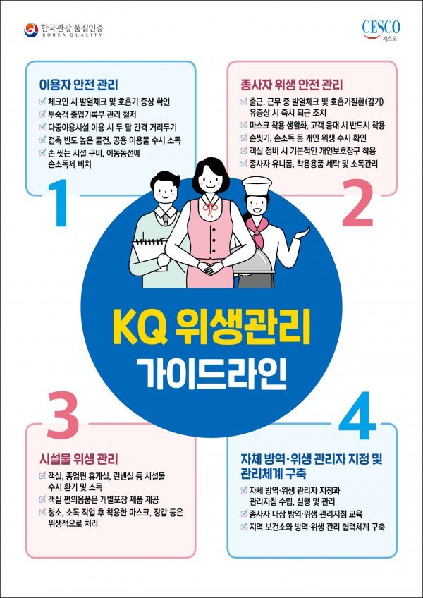 한국관광공사(사장 안영배)는 여행객이 안심하고 이용할 수 있는 숙박환경 조성을 위해 한국관광품질인증 숙박업소를 중심으로 ‘클린 KQ(한국관광 품질인증제) 캠페인’을 실시한다.27일부터 12월7일까지 대한민국 구석구석의 캠페인 특별 페이지를 통해 진행한다. 한국관광공사와 세스코가 공동으로 개발한 ‘KQ 위생관리 가이드라인’ 및 ‘위생자율점검표’를 품질인증 숙박업소에 배포하고, 가이드라인을 준수하는 서약을 통해 캠페인에 참여하면 온라인 홍보, 위생물품 및 캠페인 참여 홍보물 등을 지원한다. 또한 소비자를 대상으로 캠페인과 연계한 한국관광품질인증제 퀴즈, 가고 싶은 여행지 및 숙소 추천하기 등의 경품 이벤트을 실시한다.