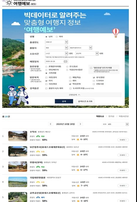 문화체육관광부는 한국관광공사와 함께 28일부터 ‘여행예보’ 서비스를 운영한다. 통신, 교통, SNS, 기상 등의 빅데이터를 기반으로 여행 선호(성별, 연령, 여행 예정 일자, 출발지, 방문 유형) 정보를 입력하면 맞춤형 여행지를 추천하고, 혼잡도 등 예정일의 여행지 상태를 미리 알려주는 서비스이다. ‘대한민국 구석구석’에서 이용할 수 있으며 모바일 웹과 앱에서도 확인할 수 있다.