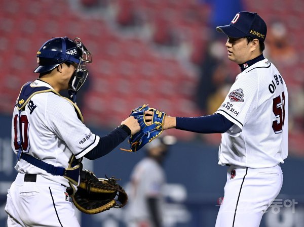 두산이 한화에 3-0으로 승리한 뒤 마무리 이영하가 박세혁 포수와 하이파이브를 나누고 있다.