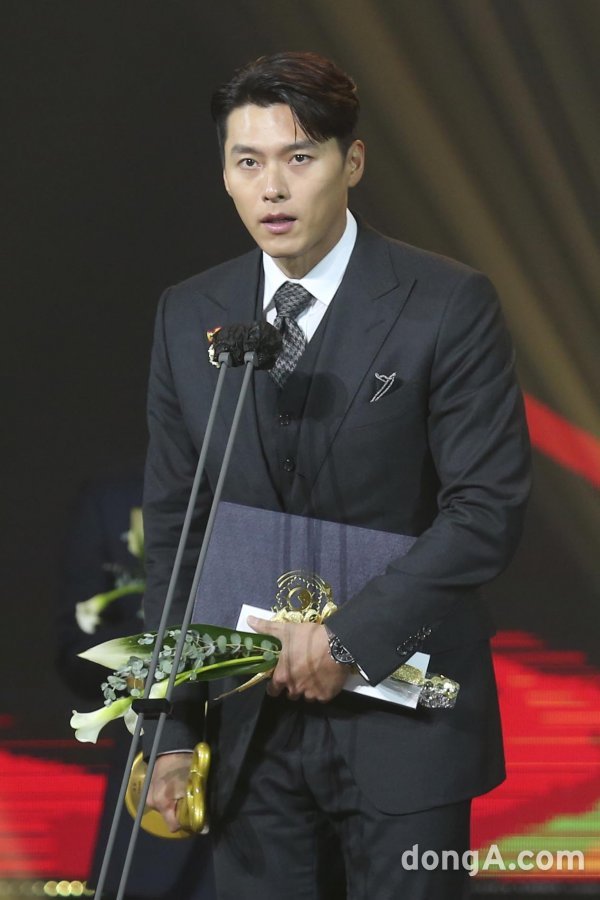 배우 현빈이 28일 오후 서울 동대문구 경희대 평화의전당에서 열린 \'2020 대한민국 대중문화예술상\' 시상식에서 대통령 표창을 받은 뒤 소감을 말하고 있다.