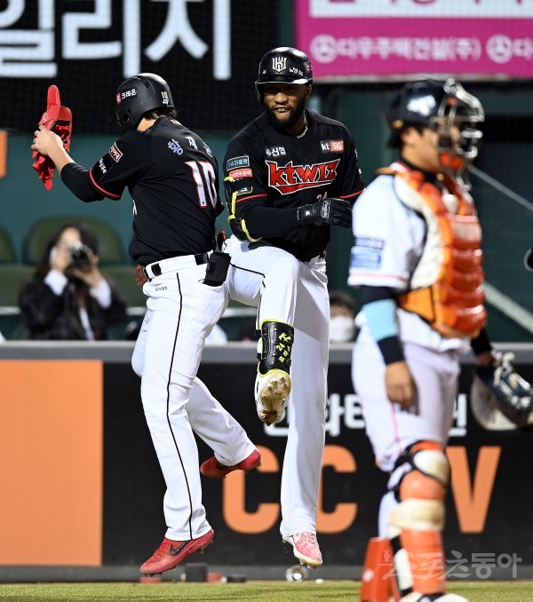 2회초 2사 2루에서 kt 황재균이 비디오 판독으로 홈런을 날린 뒤 로하스와 기쁨을 나누고 있다.