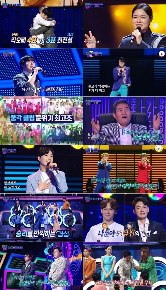이날 방송에서는 1회의 엔딩을 장식했던 '전라팀 각오빠 VS 경상팀 최전설'의 결과 발표가 시작부터 쫄깃함을 안겼다. ‘흥과 한’의 대결이라는 무대에서, 각오빠는 ‘4 대 3’ 한표 차이로 승리를 거뒀다.