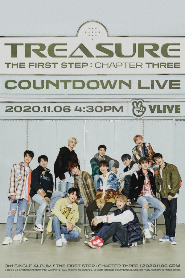 YG엔터테인먼트에 따르면 트레저는 오는 11월 6일 오후 4시 30분부터 세 번째 싱글앨범 ‘THE FIRST STEP : CHAPTER THREE’ 카운트다운 라이브를 진행한다. 이는 네이버 V라이브를 통해 약 80분 동안 방송되며 트레저 신곡 공개 10분 전 종료돼 팬들의 기대감을 최고조로 끌어올릴 예정이다.