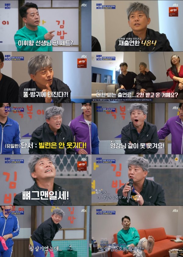세트장을 둘러본 김준호는 “지난주 이휘향 선생님 나왔을 때 느낌이 난다”는 말로 메마른 웃음으로 개그 사망을 알렸던 이휘향을 추억했다. 김준호는 고통에 절규하는 후배들에게 “나 지난번 마스크 분장을 지우는데...”라며 글썽이는 눈빛과 함께 폭풍 눈물을 언급해 큰 웃음을 안겼다.
