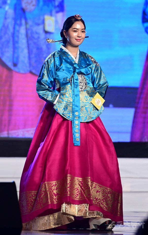 1일 서울 광진구 광장동 그랜드 워커힐 호텔에서 열린 ‘세종대왕-소헌왕후’ 선발대회에서 나르샤 부문 여자 202번 장민희가 워킹을 하고 있다.