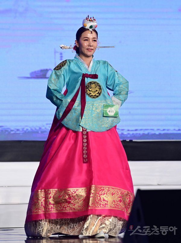 1일 서울 광진구 광장동 그랜드 워커힐 호텔에서 열린 ‘세종대왕-소헌왕후’ 선발대회에서 모도리 부문 여자 411번 남순정이 워킹을 하고 있다.