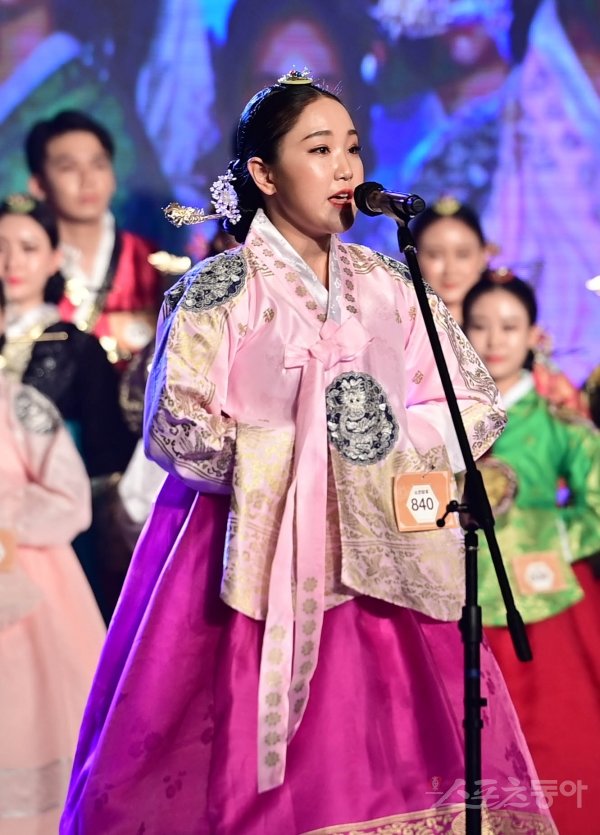 1일 서울 광진구 광장동 그랜드 워커힐 호텔에서 열린 ‘세종대왕-소헌왕후’ 선발대회에서 소헌왕후 부문 여자 840번 박소연이 자기소개를 하고 있다.