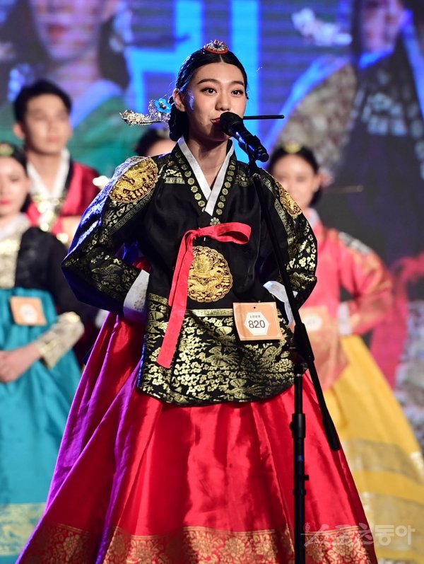 1일 서울 광진구 광장동 그랜드 워커힐 호텔에서 열린 ‘세종대왕-소헌왕후’ 선발대회에서 소헌왕후 부문 여자 820번 이예나가 자기소개를 하고 있다.