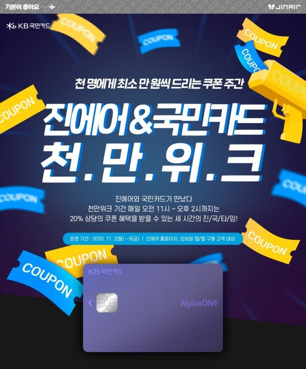 할인쿠폰은 11월15일까지 운항하는 국내선을 대상으로 사용 가능하다. 국민카드로 5만원 이상 진에어 항공권 예매 시 1만원, 10만원 이상 예매 시 2만원 할인을 제공한다. 발급 당일 한정으로 사용할 수 있다. 각각 1000명씩 선착순 마감 시 종료된다.