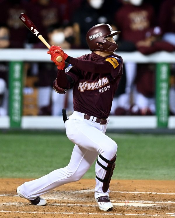 4회초 1사 2루에서 키움 이정후가 1타점 동점 적시타를 날리고 있다.