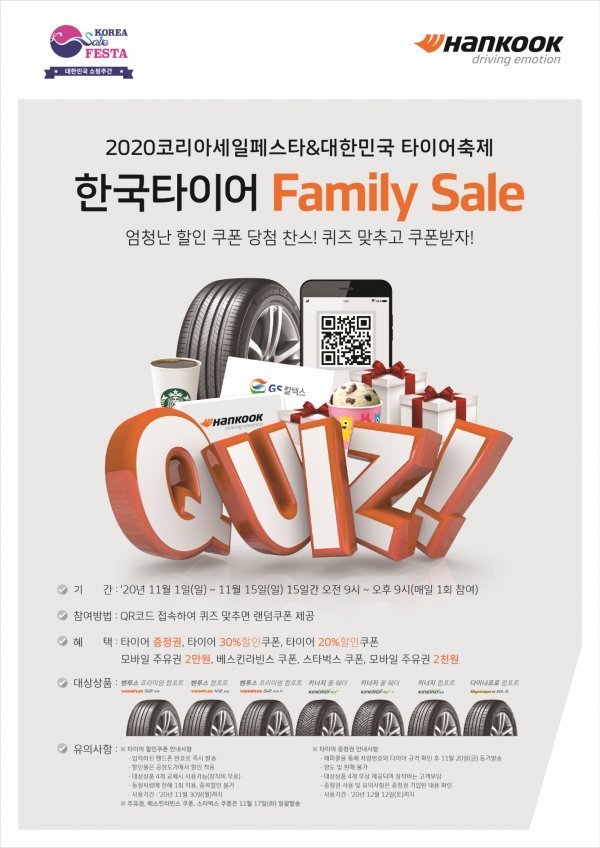 한국타이어앤테크놀로지가 2020 코리아세일페스타 기간을 맞아 11월 15일까지 퀴즈를 통해 다양한 할인 및 경품 혜택을 제공하는 ‘2020 한국타이어 패밀리 세일’ 이벤트를 진행한다.