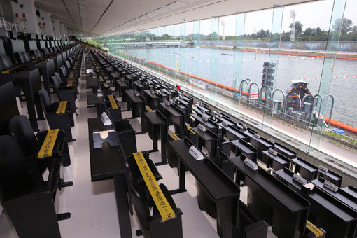 4일 부분 재개장을 앞둔 미사 경정장 관람석에 사회적 거리두기 표시가 설치되어 있다. 사진제공|국민체육진흥공단