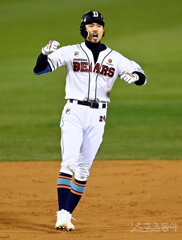 4회말 1사 1, 3루에서 두산 오재원이 1타점 2루타를 날린 뒤 환호하고 있다.