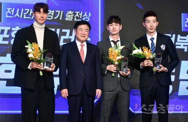 5일 서울 서대문구 홍은동 스위스그랜드호텔에서 ‘하나원큐 K리그 대상 시상식 2020’이 열렸다. K리그1 전경기/전시간 출전상을 수상한 조현우(울산), 강현무(포항), 송범근(전북)이 한국프로축구연맹 권오갑 총재와 기념촬영을 하고 있다.