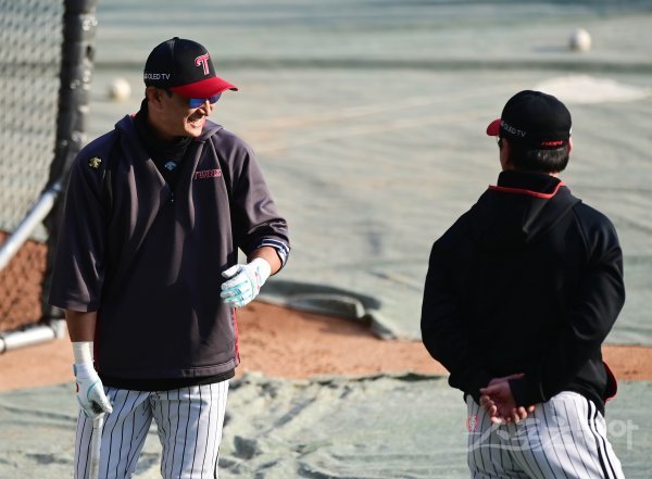 5일 서울 잠실야구장에서 ‘2020 신한은행 SOL KBO리그’ 준플레이오프 2차전 두산 베어스와 LG 트윈스의 경기가 열린다. 경기 전 훈련에서 LG 박용택이 류중일 감독을 보며 웃고 있다.