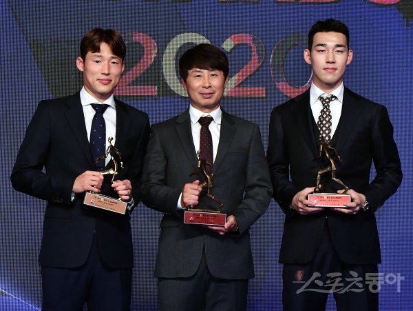 MVP 손준호(전북), 감독상을 수상한 김기동 감독(포항), 영플레이어상 송민규(포항)가 기념촬영을 하고 있다.