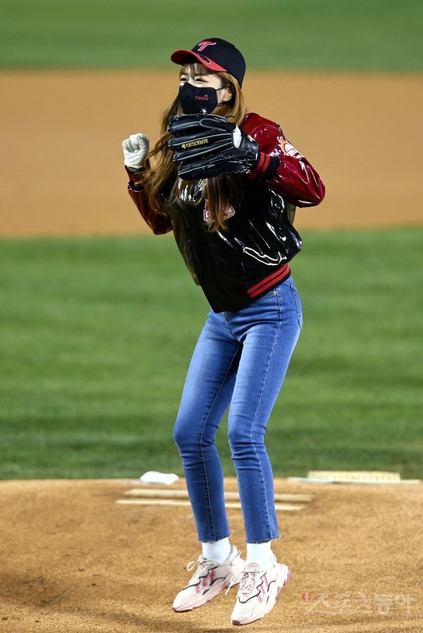 시구자로 나선 에이핑크 윤보미가 시구를 던진 뒤 뛰고 있다.