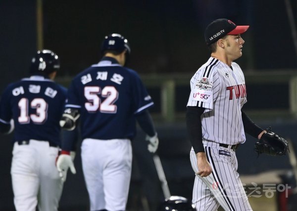4회초 1사 2루 두산 박세혁에게 1타점 중전 안타를 허용한 LG 윌슨이 아쉬워하고 있다.