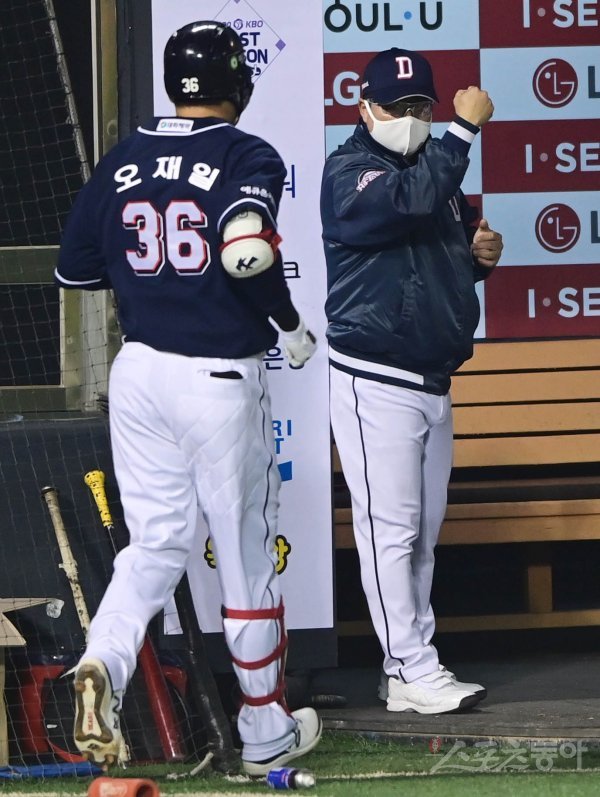 4회초 2사 1루 두산 오재일이 좌월 2점 홈런을 쳐낸 뒤 김태형 감독의 축하를 받고 있다.