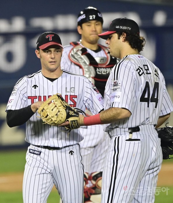 4회초 1사 1, 3루 상황에서 LG 윌슨이 마운드를 내려가고 있다.