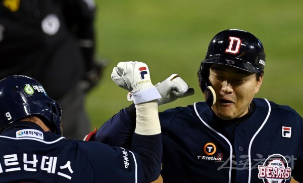 4회초 2사 1루에서 두산 오재일이 투런 홈런을 쏘아 올린 뒤 페르난데스와 기쁨을 나누고 있다.