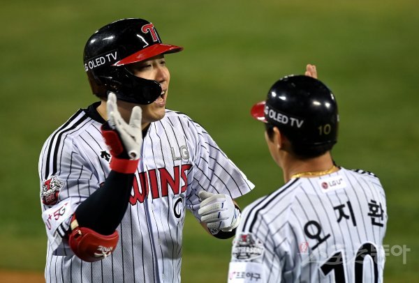 5회말 1사 1루에서 LG 김현수가 투런 홈런을 쏘아 올린 뒤 오지환과 기쁨을 나누고 있다.