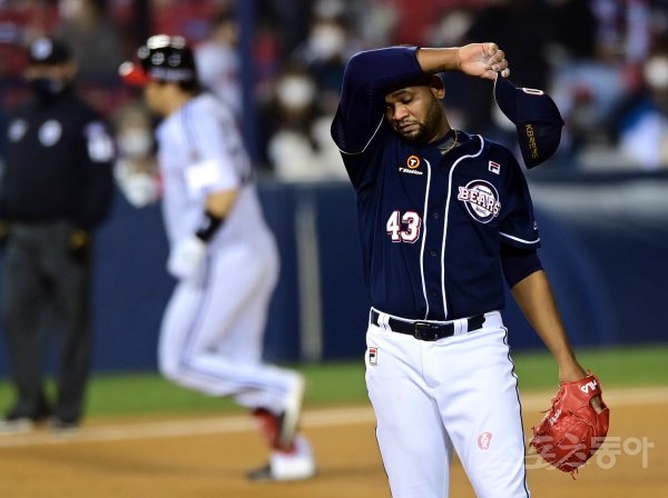 5회말 1사 1루 LG 김현수에게 우월 2점 홈런을 허용한 두산 알칸타라가 아쉬워하고 있다.