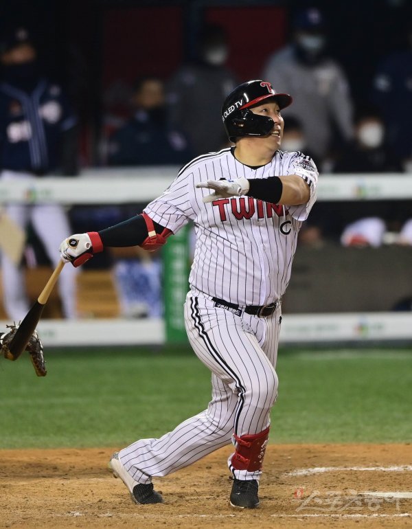 5회말 1사 1루 LG 김현수가 우월 2점 홈런을 치고 있다.