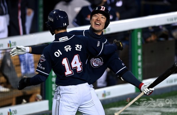 9회초 무사 1루에서 두산 허경민의 번트 때 상대 실책으로 득점에 성공한 이유찬이 김재호의 환영을 받고 있다.