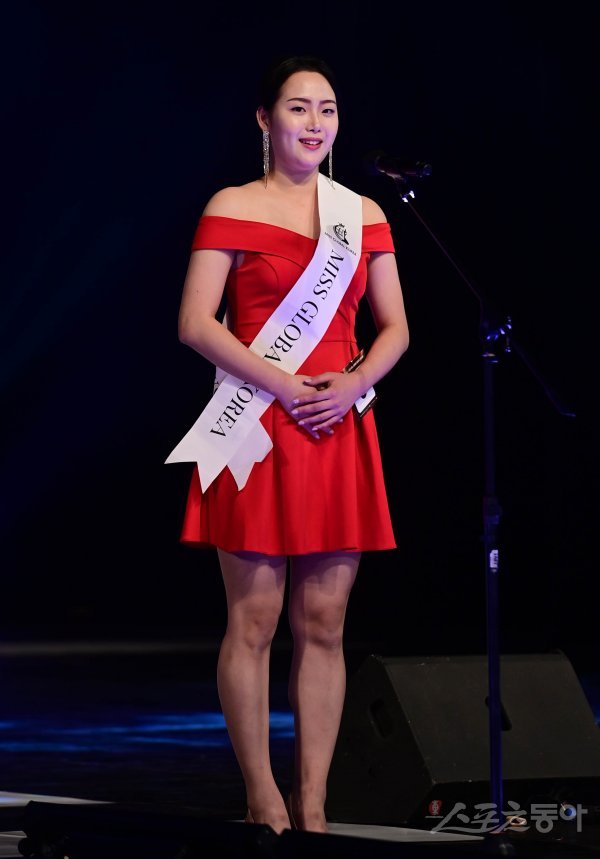 8일 서울 광진구 광장동 그랜드 워커힐 호텔에서 열린 ‘미스 글로벌 코리아’ 선발대회에서 참가번호 8번 박지연이 자기소개를 하고 있다.
