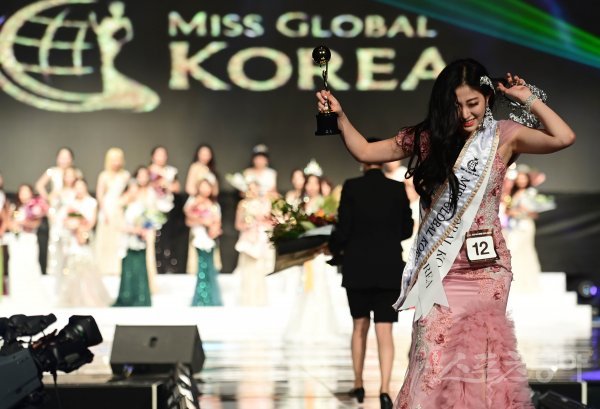 8일 서울 광진구 광장동 그랜드 워커힐 호텔에서 열린 ‘미스 글로벌 코리아’ 선발대회에서 퀸 도하연이 기념 촬영 중 떨어지는 왕관을 낚아채고 있다.