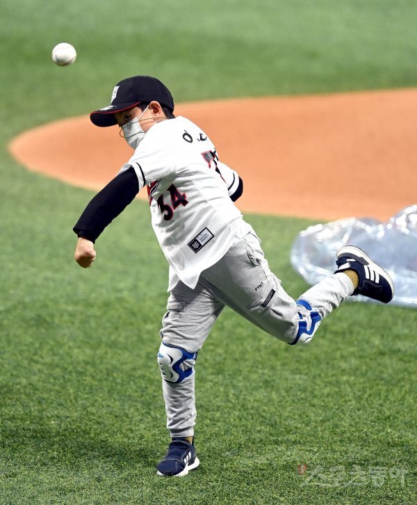 경기 전 정규시즌 개막전 시구를 한 이라온 군이 시구를 하고 있다.
