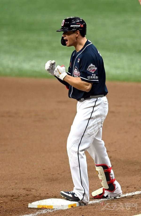 8회초 2사 1,3루 두산 김재환이 선제 1타점 적시타를 치고 1루에서 환호하고 있다.