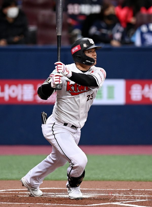 1회말 무사에서 kt 조용호가 2루타를 날리고 있다.