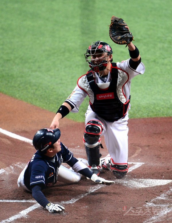 2회초 1사 2,3루 두산 외야 뜬공 때 두산 3루주자 허경민이 태그업 시도했으나 홈에서 KT 장성우에게 태그 아웃되고 있다.