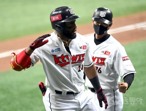 3회말 2사 KT 로하스가 추격의 우중월 솔로 홈런을 날리고 그라운드를 돌아 홈인해 세리머니를 하고 있다.