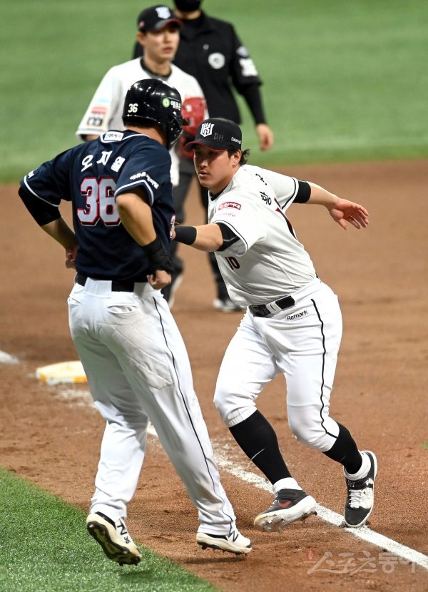 5회초 무사 1,2루 두산 내야 땅볼 때 3루주자 오재일이 협살에 걸려 KT 황재균에게 태그 아웃되고 있다.