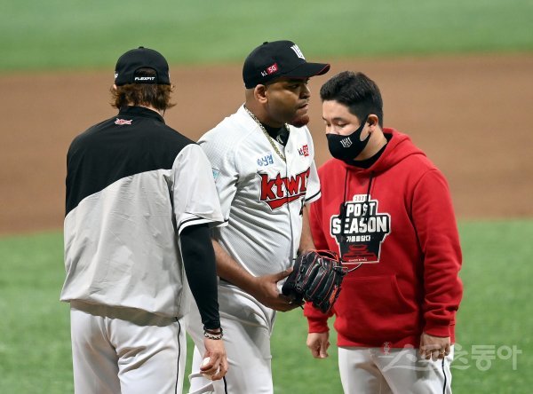 선발 투수로 등판한 KT 데스파이네가 5회초 무사 만루 상황에서 교체되고 있다.