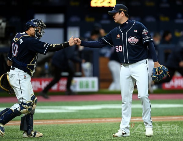 9회말 무사에서 구원 등판해 승리를 지킨 두산 이영하가 경기 종료 후 박세혁과 하이파이브를 나누고 있다.